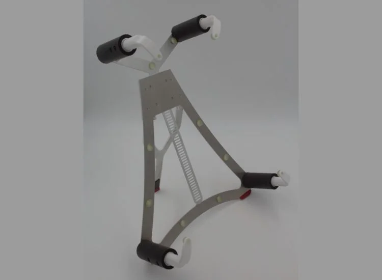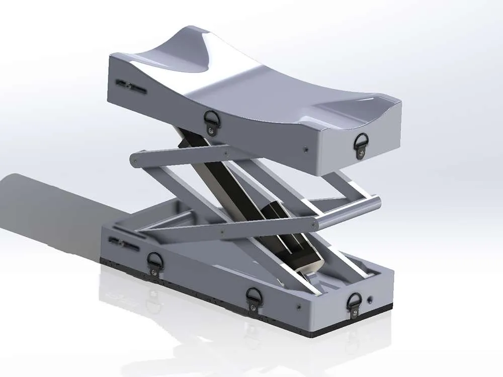 The saw support allows users to set up their table saw anywhere. It provides a stable way to use your saw horses as legs for your table saw, making it possible to work outside with a table saw without legs. The product is durable and mounts directly to the table saw. It can be screwed or nailed to the table saw for further support. The client is a carpenter and travels often for work. He wanted an alternative stand for his table saw. They are currently looking for funding to bring this idea to the marketplace. The product took 5 iterations to perfect. The product is made from Carbon fiber plastic and steel.