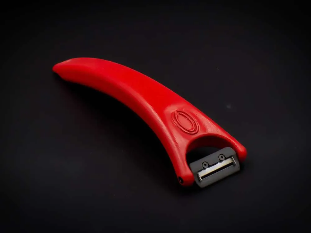 The patent pending Mango Peeler is a fruit peeler that automatically scores the fruit while you peel. The blade rotates to match the contours of any fruit but is designed to save a step while preparing mangos. This product is also a great solution to peel thicker skinned fruits. This design challenged Inventions Unlimited to design and create a blade safe enough for household use but sharp enough to effectively peel and score fruit. The blade is made from 316L stainless steel for sanitation and cleaning purposes. Our client wanted to save himself a step when preparing mangos, so he combined peeling and scoring into one action. He wanted a sleek, futuristic looking product. The design is sleek but study and perfect for any household.